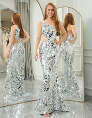 Mermaid Sparkly Silver One Shoulder Long Prom Dress