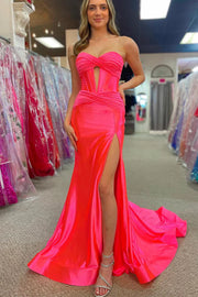 Mermaid Strapless Sweetheart Hot Pink Satin Long Prom Dress with Slit