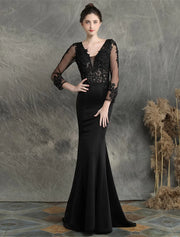 Mermaid / Trumpet Prom Dresses Elegant Dress Formal Sweep / Brush Train Long Sleeve V Neck Cotton Blend with Beading Appliques - US 2 / UK 6 / EU 32