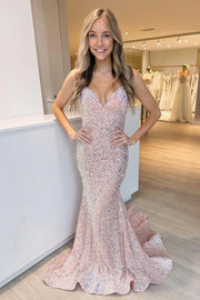 Sequins/Mermaid V Neck Spaghetti Straps Blush Pink Sequins Long Prom Dresses