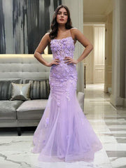 Sheath/Column Tulle Applique Spaghetti Straps Sleeveless Sweep/Brush Train Corset Dresses