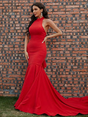 Sheath Red Stretch Crepe Ruffles Halter Sleeveless Floor Length Prom Dresses - US 2 / UK 6 / EU 32