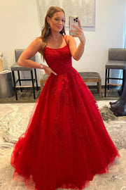 Spaghetti Straps Ball Gown Sweetheart Red Tulle Lace Prom Dresses with Appliques