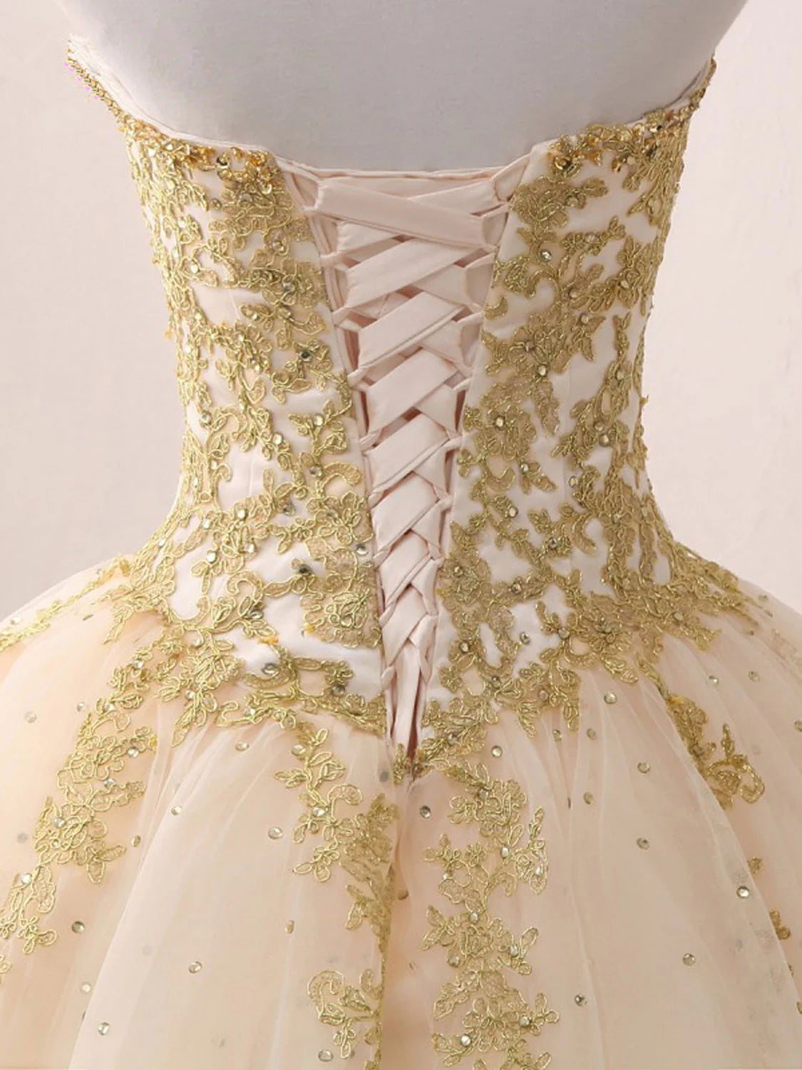 Ball Gown Princess Dress Performance Quinceanera Floor Length Champagne Sweetheart Neck Tulle Long Prom Gown Sweet 16 Dress V Neck Polyester with Sequins Appliques