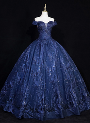 Ball Gown Prom Dresses Floral Dress Quinceanera Navy Blue Lace Off Shoulder Tulle Formal Dress Prom Dress