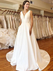 A-Line/Princess Satin Ruffles V-neck Sleeveless Sweep/Brush Train Wedding Dresses - As Picture / US 2 / UK 6 / EU 32