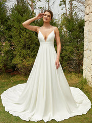 A-Line/Princess Stretch Crepe Lace V-neck Sleeveless Cathedral Train Wedding Dresses