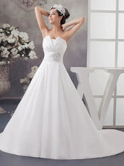 A-Line Wedding Dresses Strapless Chapel Train Satin Strapless with Ruched Beading Draping