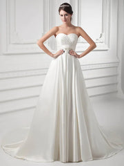 A-Line Wedding Dresses Sweetheart Neckline Court Train Satin Strapless with Buttons Ruched Beading