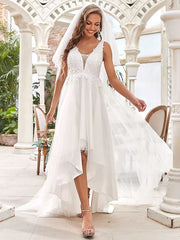 A-Line Wedding Dresses V Neck Chiffon Lace Tulle Sleeveless Romantic Casual with Lace Ruched Draping