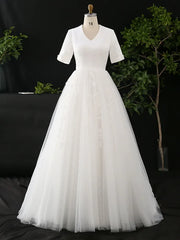 A-Line Wedding Dresses V Neck Court Train Satin Tulle Half Sleeve Simple Elegant with Appliques