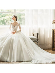 Ball Gown Wedding Dresses V Neck Chapel Train Tulle Long Sleeve Formal with Pleats Appliques