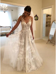 Beach Boho Wedding Dresses A-Line V Neck Sleeveless Sweep / Brush Train Lace Bridal Gowns With Appliques