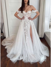 Beach Formal Wedding Dresses A-Line Sweetheart Sleeveless Court Train Lace Bridal Gowns With Pleats Split Front