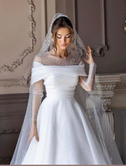 Beach Little White Dresses Formal Wedding Dresses A-Line Illusion Neck Long Sleeve Floor Length Tulle Bridal Gowns With Ruched Beading