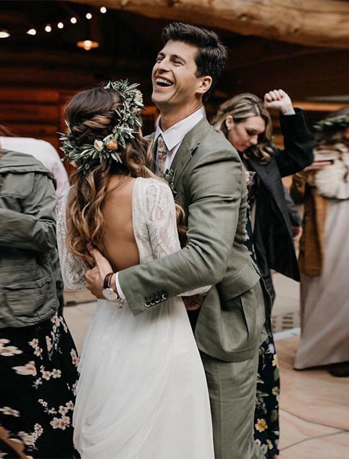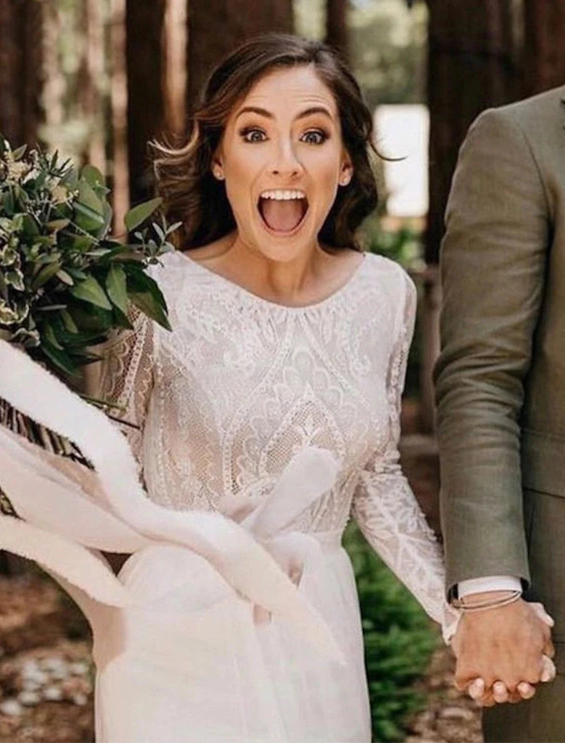 Beach Open Back Boho Wedding Dresses A-Line Scoop Neck Long Sleeve Sweep / Brush Train Lace Bridal Gowns With Pleats Appliques
