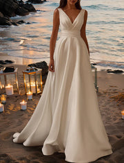 Beach Simple Wedding Dresses A-Line V Neck Sleeveless Court Train Satin Bridal Gowns With Pleats