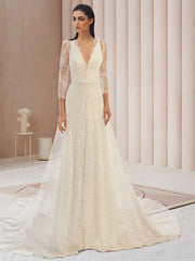 Engagement Open Back Formal Wedding Dresses Court Train Two Piece Long Sleeve V Neck Lace With Bow(s) - As picture / US 2 / UK 6 / EU 32