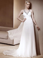 Princess A-Line Wedding Dresses V Neck Court Train Chiffon Sleeveless Sparkle & Shine with Sequin