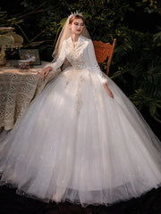 Princess Ball Gown Wedding Dresses V Neck Floor Length Lace Tulle Long Sleeve Romantic Sparkle & Shine Luxurious with Appliques