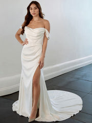 Sheath/Column Charmeuse Ruched Off-the-Shoulder Sleeveless Court Train Wedding Dresses