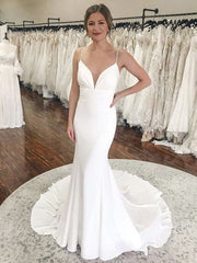Sheath/Column Stretch Crepe Ruched V-neck Sleeveless Court Train Wedding Dresses - White / US 2 / UK 6 / EU 32