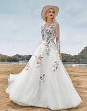 Tulle Long Sleeves Long Ivory Wedding Dress with Embroidery