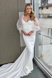 White Illusion Bell Sleeves V Neck Mermaid Long Wedding Dress