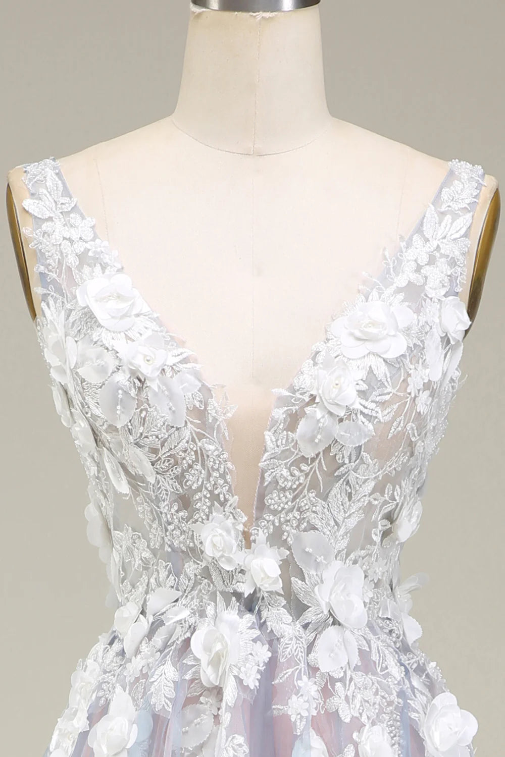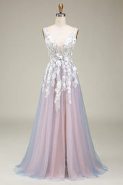 A Line Deep V Neck Grey Pink Long Prom Dress with 3D Flora Appliques