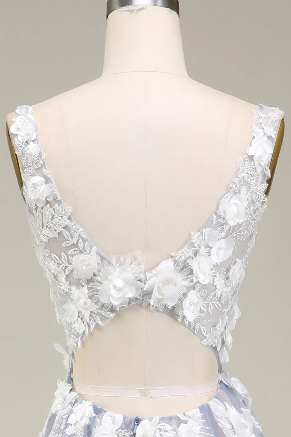 A Line Deep V Neck Grey Pink Long Prom Dress with 3D Flora Appliques - US 2 / UK 6 / EU 32