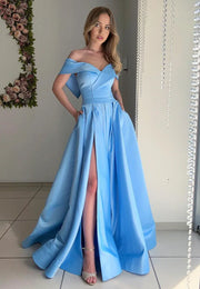 A-Line Off the Shoulder Blue Satin Evening Dresses Long Prom Dresses With Pocket