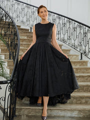 A-Line/Princess Lace Applique Scoop Sleeveless Asymmetrical Party Dresses Wedding Guest Dresses - Black
