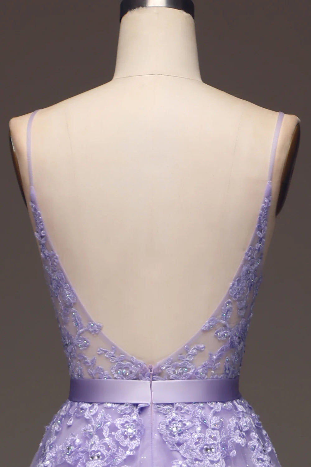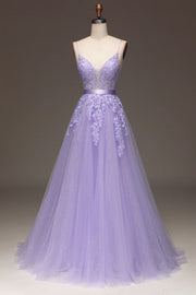 A-Line Spaghetti Straps V Neck Long Beaded and Tulle Prom Dress with Appliques