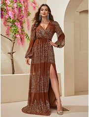 A-Line Wedding Guest Dresses Sparkle & Shine Dress Formal Evening Party Sweep / Brush Train Long Sleeve V Neck Polyester with Rhinestone Slit - Brown
