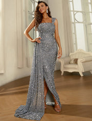 Mermaid / Trumpet Wedding Guest Dresses Sparkle & Shine Dress Formal Evening Party Sweep / Brush Train Sleeveless One Shoulder Sequined with Sequin Slit - Light Grey