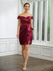 Sheath/Column Elastic Woven Satin Ruched Off-the-Shoulder Sleeveless Short/Mini Wedding Guest Dresses - Burgundy