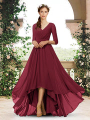 A-Line Bridesmaid Dress V Neck 3/4 Length Sleeve Elegant Sweep / Brush Train / Asymmetrical Chiffon with Pleats