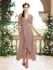 A-Line Bridesmaid Dress V Neck Short Sleeve Elegant Asymmetrical / Ankle Length Chiffon with Sash / Ribbon / Ruffles