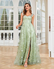 A Line Butterflies Appliques Green Long Prom Dress With Slit - US 2 / UK 6 / EU 32