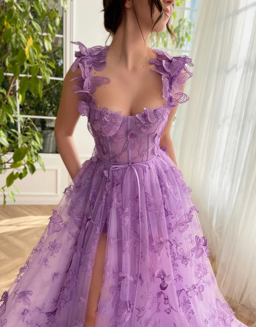 A Line Butterflies Green Long Prom Dress With Slit - US 2 / UK 6 / EU 32