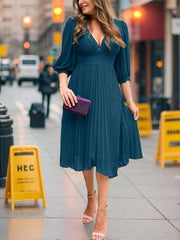 A-Line Chiffon Ruched V-neck 3/4 Sleeves Tea-Length Mother of the Bride Dresses