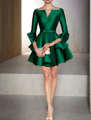 A-Line Cocktail Dresses Party Dress Formal Fall Short / Mini Long Sleeve V Neck Satin with Ruffles - Dark Green