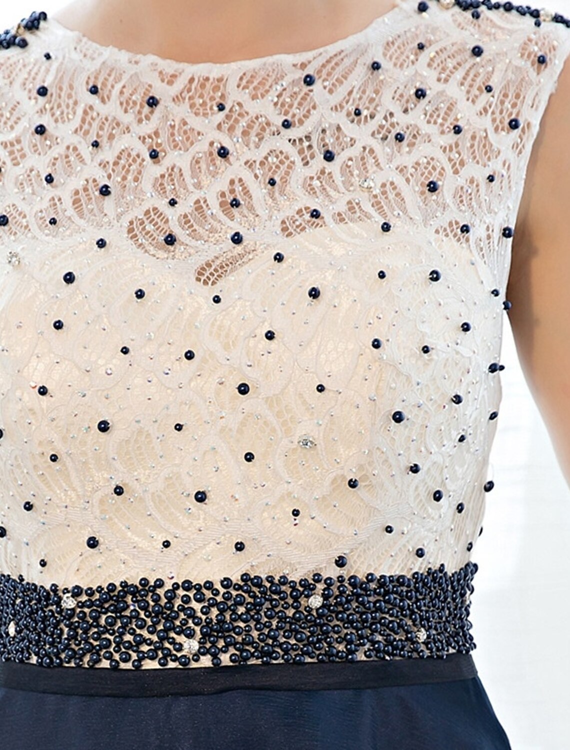 A-Line Elegant Dress Wedding Guest Prom Floor Length Sleeveless Illusion Neck Tulle Over Lace with Beading - Dark Navy