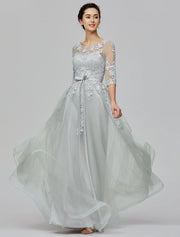 A-Line Evening Dress Wedding Guest Prom Floor Length Half Sleeve Illusion Neck Tulle with Bow(s) Appliques