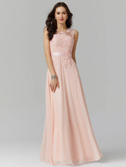 A-Line Evening Gown High Waisted Prom Dress Bridesmaid Wedding Guest Chiffon Floor Length Sleeveless Illusion Neck Georgette with Appliques - Pearl Pink