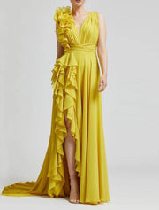 A-Line Evening Gown Open Back Dress Wedding Guest Sweep / Brush Train Sleeveless V Neck Wednesday Addams Family Cotton Backless with Pleats Ruched Ruffles - US 2 / UK 6 / EU 32