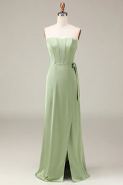 A-line Matcha Strapless Corset Satin Bridesmaid Dress with Slit - Matcha
