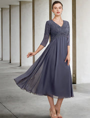 A-Line Mother of the Bride Dress Fall Wedding Guest Plus Size Elegant V Neck Tea Length Chiffon Lace 3/4 Length Sleeve with Ruffles Appliques