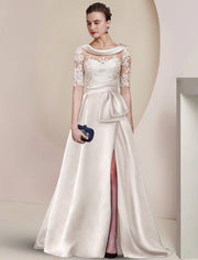 A-Line Mother of the Bride Dress Formal Wedding Guest Elegant Scoop Neck Sweep / Brush Train Satin Lace Half Sleeve with Ruched Appliques