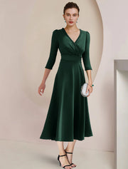 A-Line Mother of the Bride Dress Formal Wedding Guest Party Elegant V Neck Tea Length Stretch Fabric 3/4 Length Sleeve with Beading Side-Draped